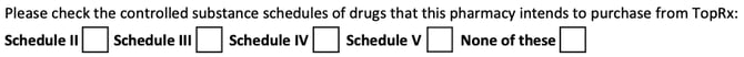 1. Complete TopRx's controlled substance application (request a copy of the application by emailing sales@pharmacymarketplace.com or see below for a link to the application.)